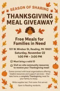 Saturday, November 22nd, 1:00 p.m.- 3:00 p.m.- Thanksgiving Meal Giveaway- 101 W. Windsor St., Reading, Pa 19601- Open to all Reading residents. Valid photo ID required. First come, first served.